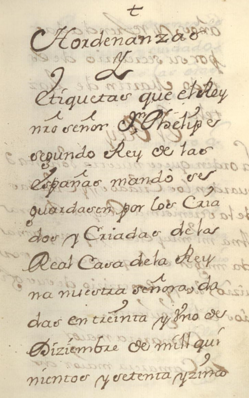 Hordenanzas y etiquetas que el rey nuestro señor don Phelipe segundo, rey de las Españas, mandó se guardasen por los criados y criadas de la Real Casa de la reyna nuestra señora, dadas en treinta y uno de diziembre de mill quinientos y setenta y zinco años y refrendadas por su secretario de estado, Martín de Gaztelu
