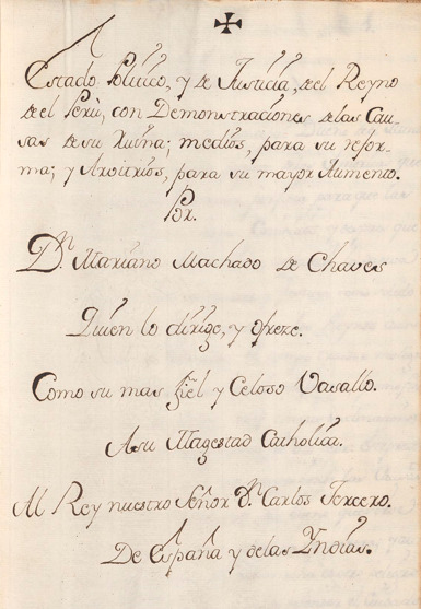 Estado político y de justicia de el reyno de el Perú, con demonstraciones de las causas de su ruina, medios para su reforma y arvitrios para su mayor aumento
