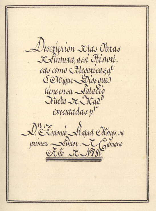 Descripción de las Obras de Pintura, assí Históricas como Alegóricas, que S.M. (que Dios guarde) tiene en su Palacio Nuebo de Madrid, executadas por Don Antonio Rafael Mengs, su primer Pintor de Cámara. Año de 1781