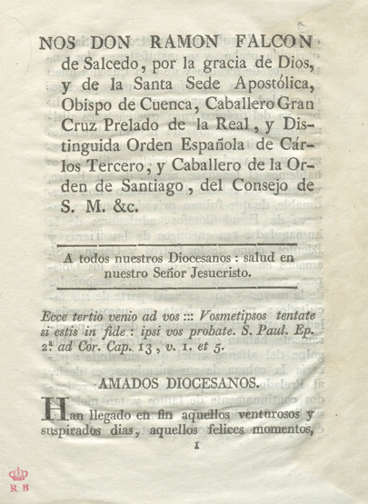 [Carta pastoral del Obispo de Cuenca Don Ramón Falcón de Salcedo a sus diocesanos, felicitándose por el fin del imperio constitucional y la vuelta al orden religioso con el Gobierno de Fernando VII]