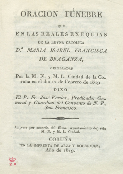 Oración fúnebre que en las reales exequias de la Reyna Católica Dª María Isabel Francisca de Braganza, celebradas ... en la Coruña el día 12 de febrero de 1819