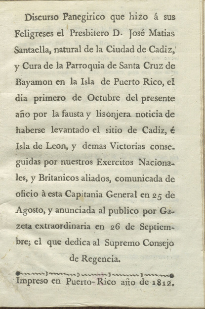 Discurso panegirico que hizo á sus feligreses el presbitero D. José Matias Santaellas [...] cura de la parroquia de Santa Cruz de Bayamon en la Isla de Puerto Rico, [...] por la fausta y lisonjera noticia de haberse levantado el sitio de Cádiz é Isla de León y demás victorias conseguidas ...