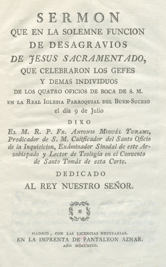 Sermón que en la solemne función de desagravios de Jesús Sacramentado, que celebraron los gefes y demás individuos de los quatro Oficios de Boca de S.M. en la Real Iglesia Parroquial del Buen-Suceso el dia 9 de Julio
