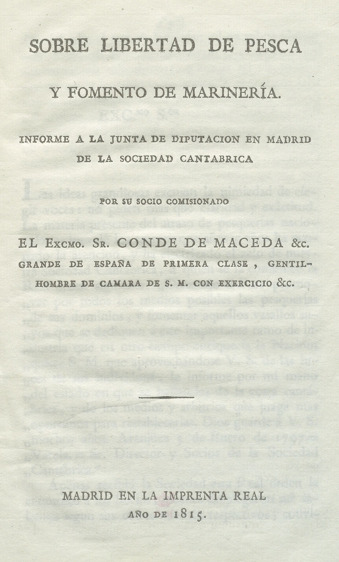 Sobre libertad de pesca y fomento de marinería : informe a la Junta de Diputacion en Madrid de la Sociedad Cantabrica