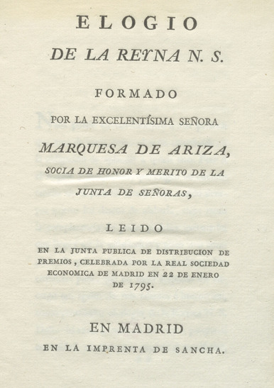 Elogio de la Reyna N.S. / formado por la... Marquesa de Ariza... ; leido en la Junta Publica de Distribucion de Premios, celebrada por la Real Sociedad Economica de Madrid en 22 de enero de 1795