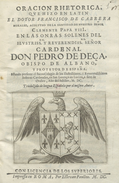 Oración rhetorica que hizo en latín el Doctor Francisco de Cabrera Morales, acolytho de... Clemente Papa VIII, en las onras solemnes del... Cardenal Don Pedro de Deça, Obispo de Albano...
