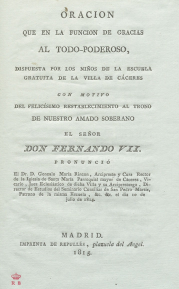 Oración que en la función de gracias al Todo-Poderoso, dispuesta por los niños de la Escuela gratuita de la Villa de Cáceres con motivo del felicísimo restablecimiento al trono de... Don Fernando VII