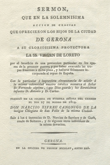 Sermón que en la... acción de gracias que ofrecieron los hijos de la ciudad de Gerona a... la SS. Virgen de Loreto por el beneficio de una protección... en... la presente guerra ; y por haber evacuado las tropas francesas a dicha plaza...