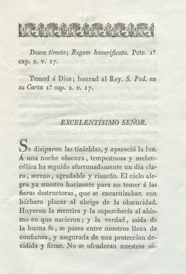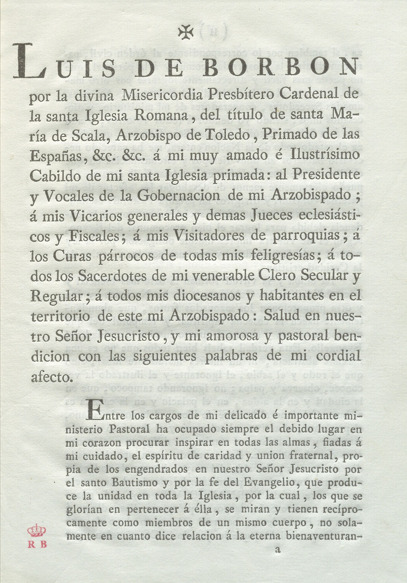 Luis de Borbon, por la divina Misericordia Presbítero Cardenal de la santa Iglesia Romana, del título de Santa Maria de Scala, Arzobispo de Toledo... á mi muy amado é ilustrisimo Cabildo de mi Santa Iglesia Primada... Entre los cargos de mi delicado é importante ministerio Pastoral ha ocupado siempre el debido lugar en mi corazon procurar inspirar en todas las almas, fiadas a mi cuidado, el espíritu de caridad y union fraternal...