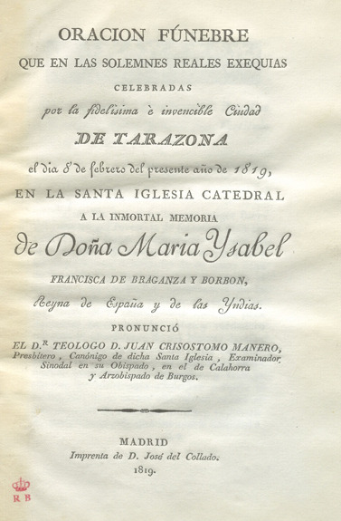 Oración fúnebre que en las solemnes exequias celebradas por la fidelísima è invencible Ciudad de Tarazona, el día 8 de febrero de 1819... a la memoria de Dña. María Isabel Francisca de Braganza y Borbón, Reyna de España y de las Yndias
