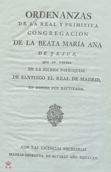 Ordenanzas de la Real y primitiva Congregación de la Beata María Ana de Jesús que se venera en la Iglesia Parroquial de Santiago el Real de Madrid, en donde fué bautizada