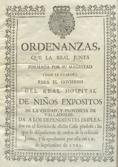 Ordenanzas que la Real Junta formada por su magestad... para el Govierno del Real Hospital de Niños Expositos de... Valladolid, da a los dependientes empleados en el servicio de dicha Casa... y se aprobaron por ella en 19 de septiembre de 1763