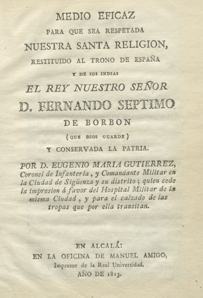 Medio eficaz para que sea respetada nuestra santa religion, restituido al trono de España y de sus Indias el Rey Nuestro Señor D. Fernando Septimo de Borbon...