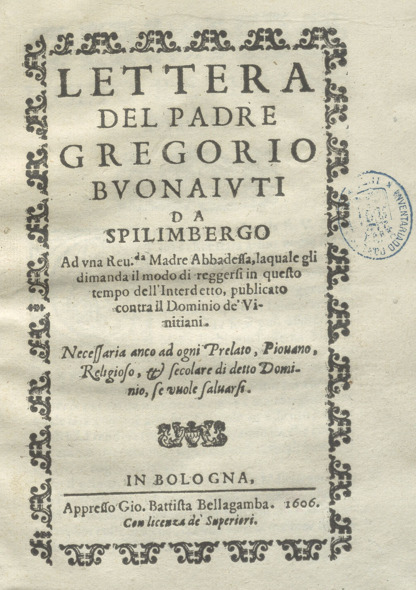 Lettera del padre Gregorio Buonaiuti da Spilimbergo ad vna... abbadessa la quale gli dimanda il modo di reggersi in questo tempo dell'interdetto publicato contra il dominio de' Viniatini..