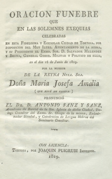 Oración fúnebre que en las solemnes exequias celebradas en esta Fidelísima y Egemplar Ciudad de Tortosa... en el dia 16 de Junio de 1829 por la muerte de la Reyna Ntra. Sra. Doña María Josefa Amalia...