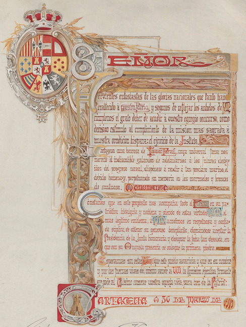 [Nombramiento a S. M. D. Alfonso XIII como Presidente de la Junta Honoraria encargada de las obras del monumento a Isaac Peral]